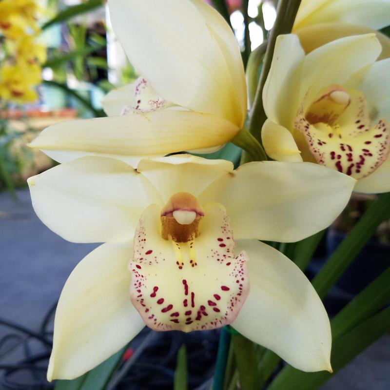 A very nice cream colored novelty cymbidium with a delicately spotted lip. This is one of the few cream colored from the hybrid of Via Ambarino with Eastern Bunny. Near blooming size division in a gallon pot.