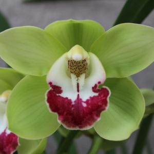 A very clean green flower with bold red lips on tall upright spikes. Near blooming size division in a gallon pot.
