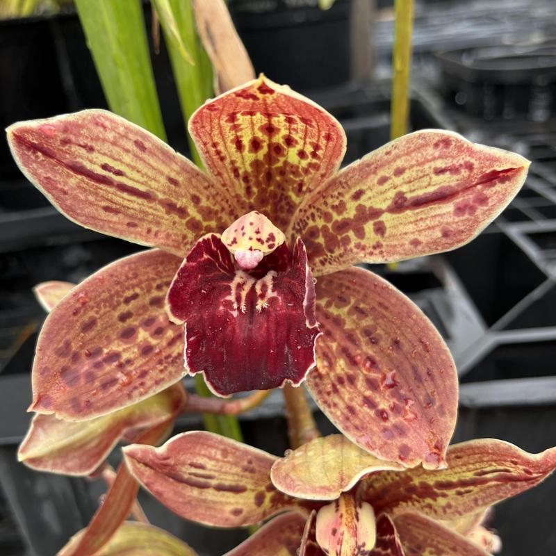 This is a very nice spotted standard cymbidium on upright arching spikes. Near blooming size division in a gallon pot.